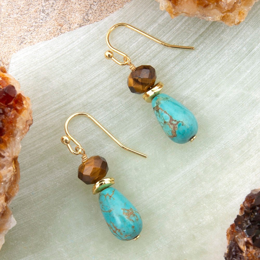 Handcrafted with meticulous attention to detail, these sophisticated earrings showcase genuine brown smoky tiger's eye paired with genuine blue magnesite bead. Delicate 18k gold-plated brass elements are between the stones, creating an elegant double-drop silhouette. Measuring 1.46 inches in length with a refined .33-inch width at the widest point, they offer a total weight at just 5 grams. Each pair is individually finished by hand, ensuring a distinctive piece that bridges natural beauty with refined craftsmanship.