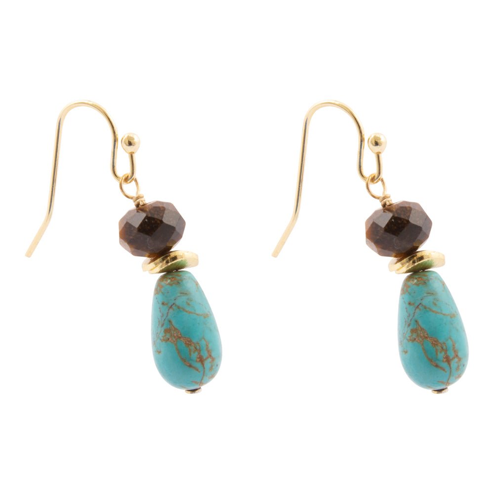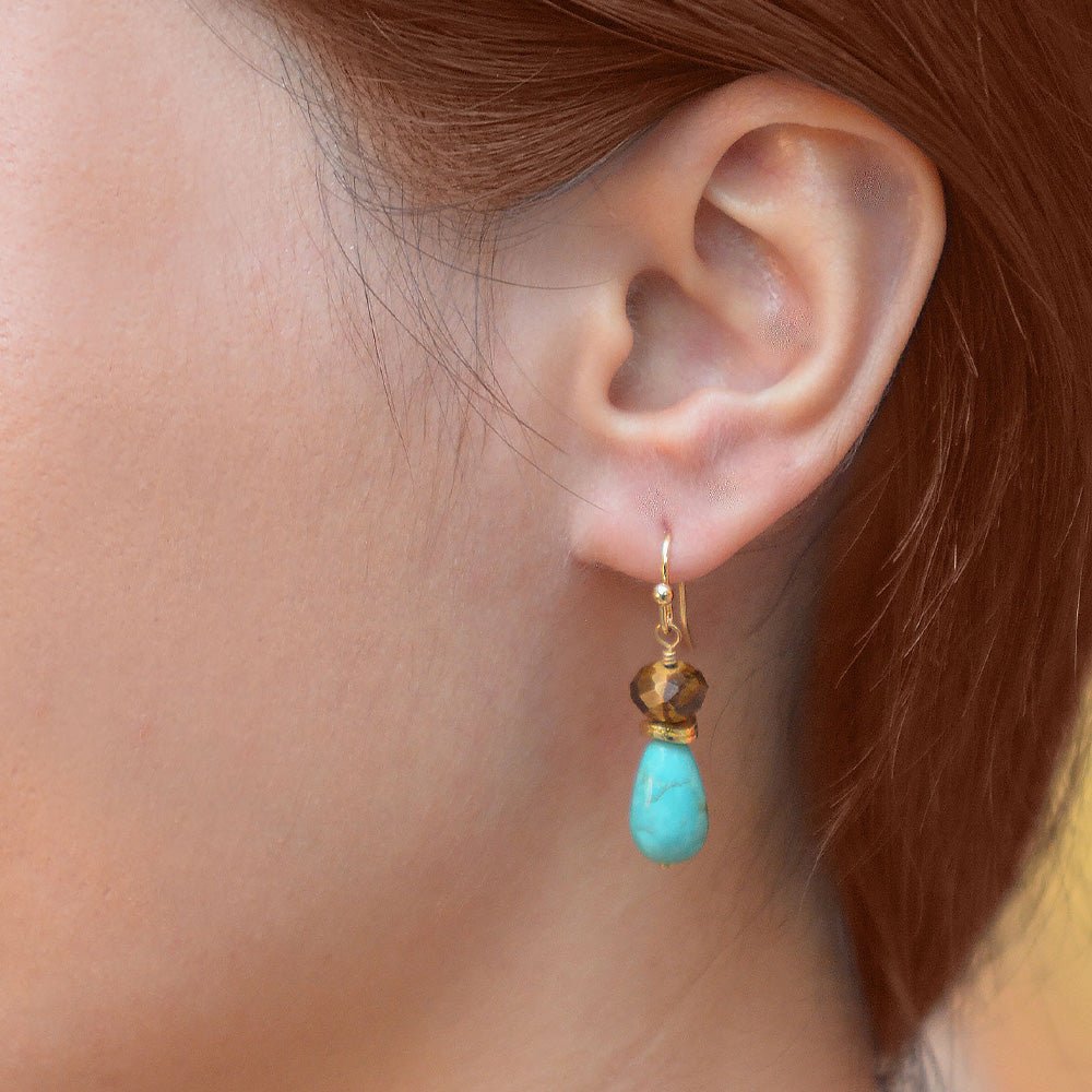 Brown Smoky Tiger's Eye and Turquoise Double Drop Earrings