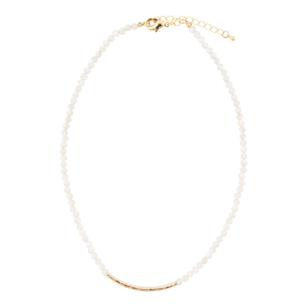 Unlock a unique, one-of-a-kind beauty with our White Mother of Pearl Golden Bar Necklace. Crafted and finished by hand, this stunning piece is made of genuine white pearl beads and 18k gold-plated brass metal for a timeless look. The necklace measures 16" + 2" chain extender with a lobster clasp closure and weighs a total of 10.95g and a widest point od 4mm. Make every look unforgettable with this exquisite necklace!