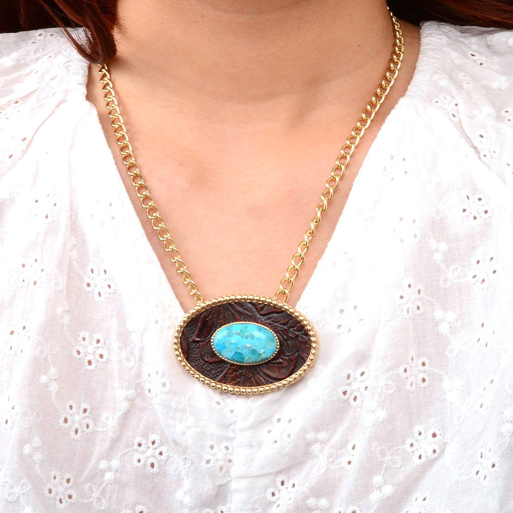 Blue Turquoise Rosette Leather Pendant Golden Chain Necklace