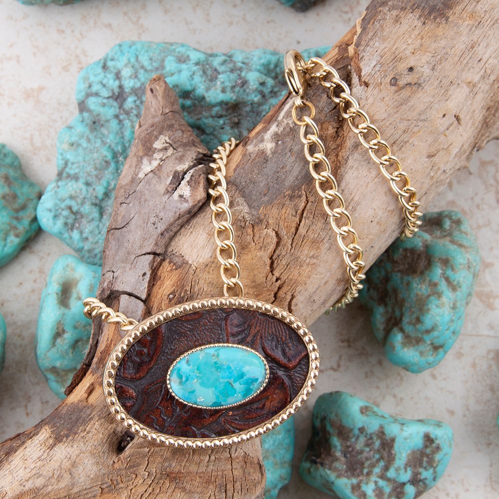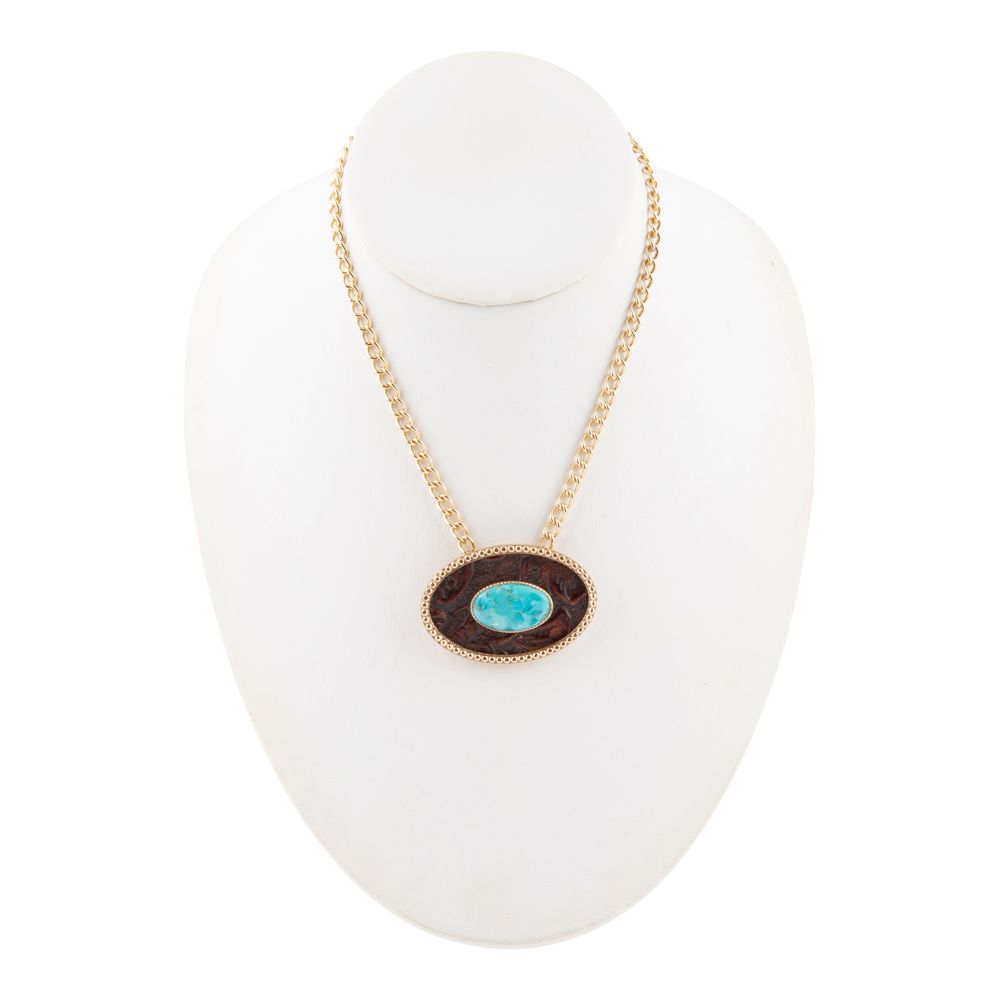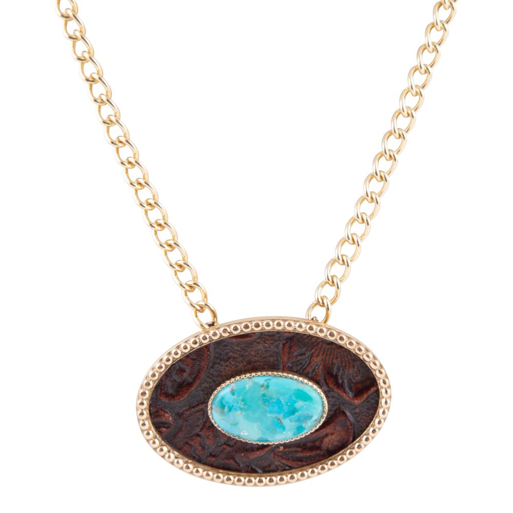 This exquisite piece features an 18" golden bronze chain supporting an oval pendant crafted from genuine embossed leather and adorned with a genuine blue turquoise stone, all framed in golden bronze. The pendant measures 1.34" in length and 1.97" at its widest point, weighing a total of 41.3g. Each detail is meticulously handcrafted and finished to perfection.