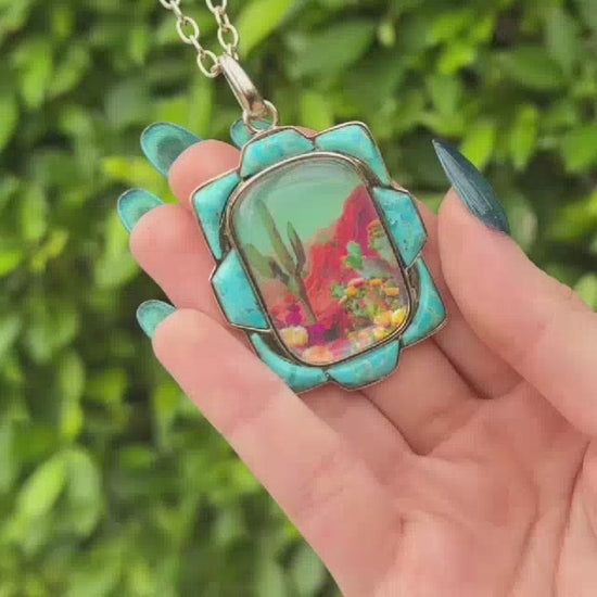 Experience the breathtaking beauty of the Scenic Sedona Desert with our Desert Blue Turquoise Golden Pendant Necklace. This stunning piece features a genuine turquoise stone pendant surrounded by a vibrant desert picture under a clear quartz overlay. The adjustable necklace can be worn up to 30" with a secure lobster clasp closure. Admire the 2.25" length from the bale and 1.5" width at its widest point. The necklace weighs 1.12 oz and is expertly crafted and finished by hand. Treat yourself to this truly remarkable and one-of-a-kind piece.