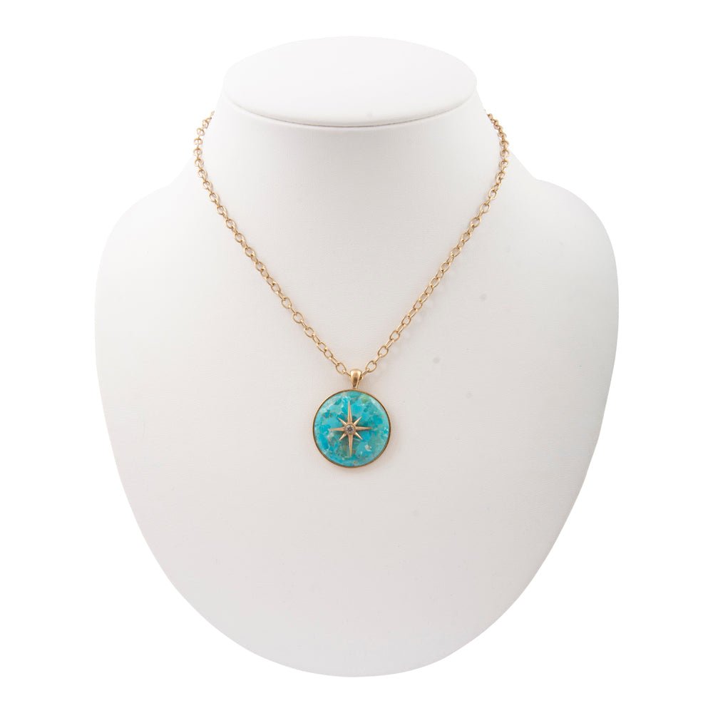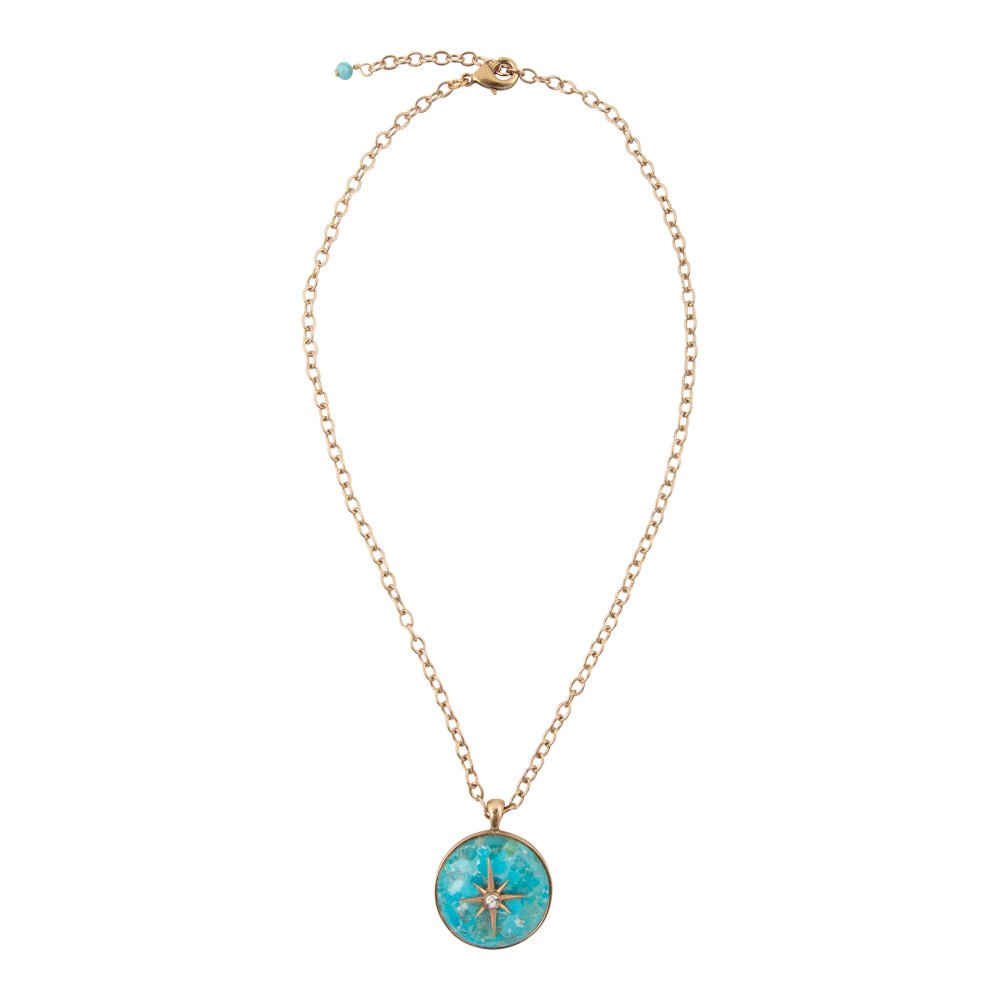 This elegant necklace features a golden bronze chain measuring 19" and a secure lobster clasp. Its pendant showcases genuine blue turquoise circle, framed in golden bronze, and accented by a central golden bronze star and a cubic zirconia. The pendant measures 1.41" in length and 1.13" at its widest point, with a total weight of 16.7g. Each piece is meticulously handcrafted and finished to perfection.