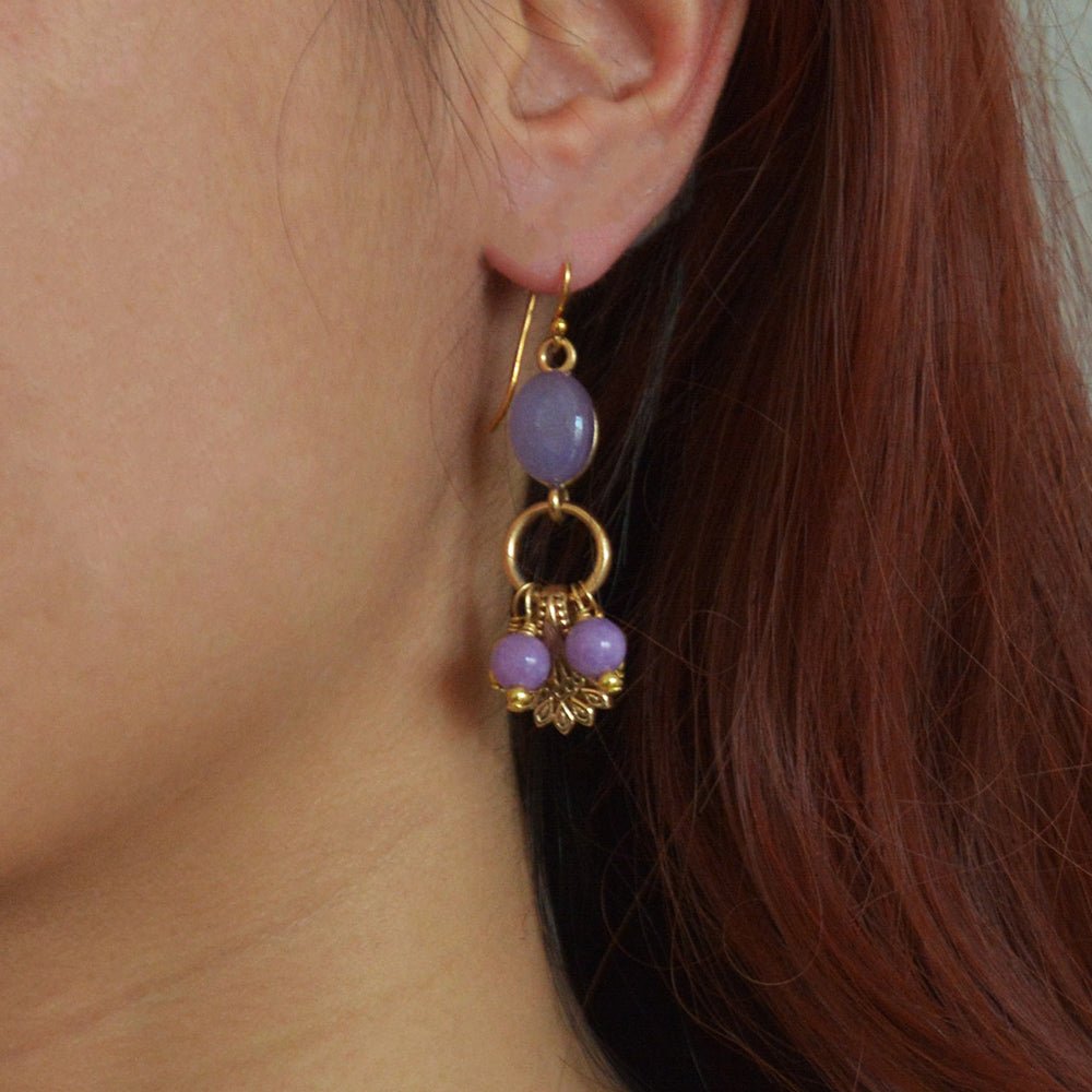 These earrings showcase genuine purple quartz stones accented with elegant golden bronze details. They measure 2.12 inches in length, with a width of 0.5 inches at the widest point and weigh a total of 10.5 grams. Each pair is carefully handcrafted and finished by skilled artisans.
