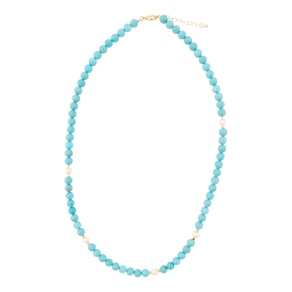 This elegant necklace showcases a 26.5" strand of genuine blue magnesite and white pearl beads, accented by golden hematite beads. It includes a 2" extender crafted from 18k gold-plated brass and secures with a lobster clasp. Measuring up to .33" at its widest point and weighing a total of 62.78g, this piece is meticulously handcrafted for a refined finish.