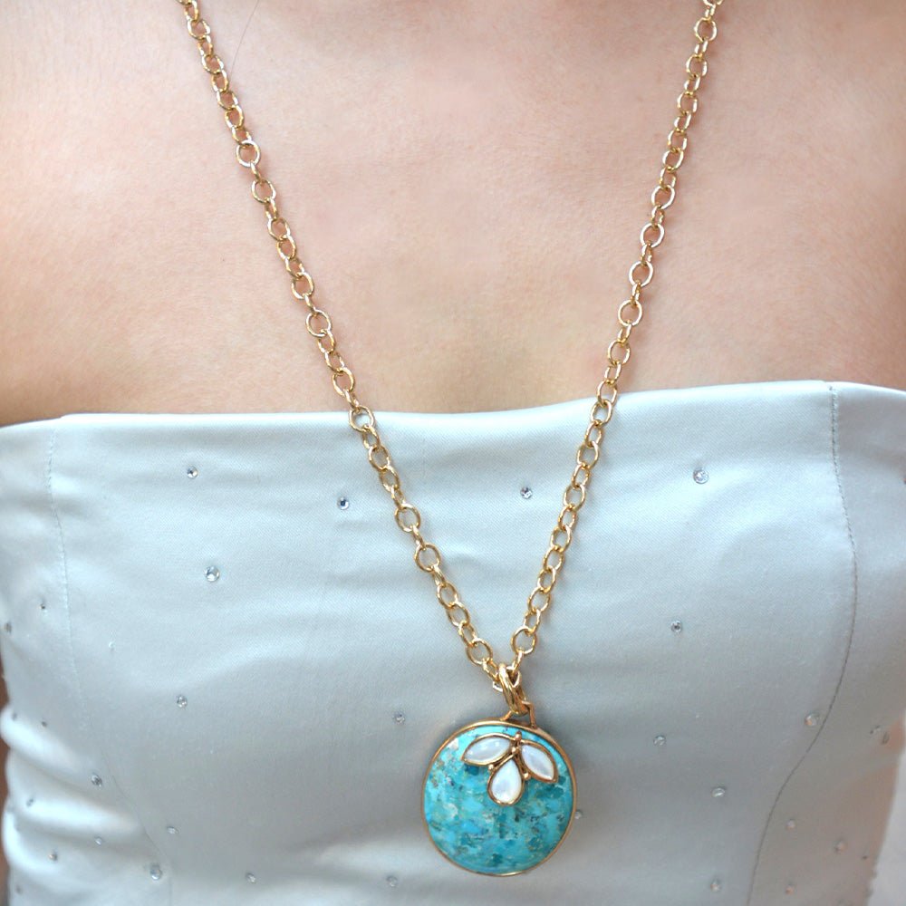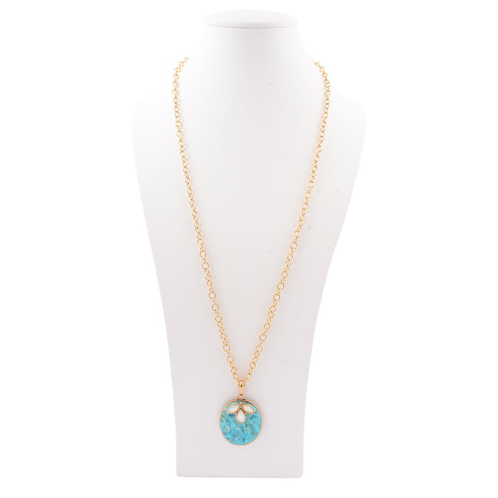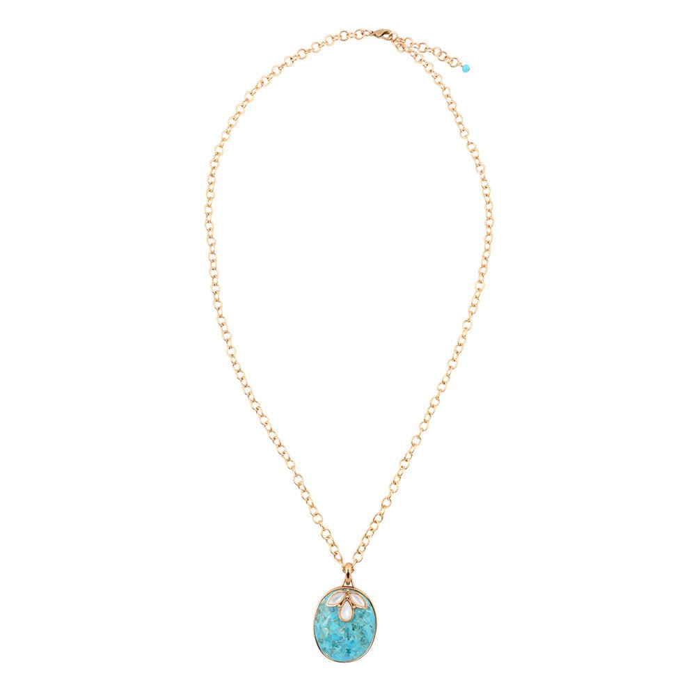 This elegant necklace features a 32" long golden bronze chain secured with a lobster clasp. Its pendant showcases an oval genuine blue turquoise stone, accented by three genuine white mother of pearl stones, all set in golden bronze. Measuring 2.16" in length and 1.38" at its widest point, the handcrafted piece weighs a total of 43.38 grams, combining timeless beauty with artisanal craftsmanship.