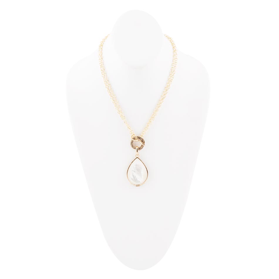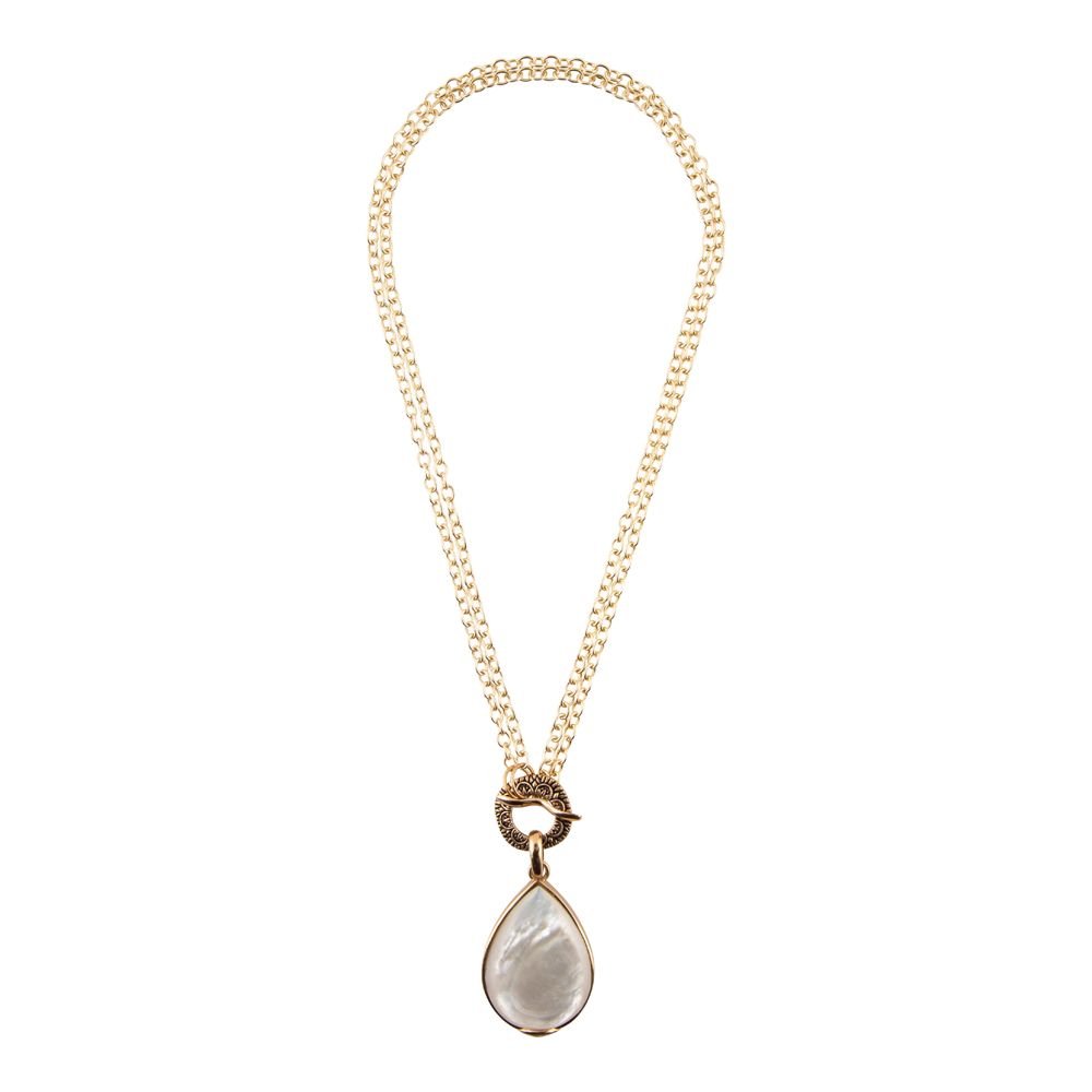 This elegant necklace features a 17.5" golden bronze double chain, beautifully complemented by a teardrop-shaped pendant crafted from genuine white mother of pearl, framed in golden bronze. The pendant, measuring 2.95" in length and 1.25" at its widest, is topped with a matching golden bronze hoop. Weighing a total of 37g, each piece is carefully handcrafted and meticulously finished for a refined touch.