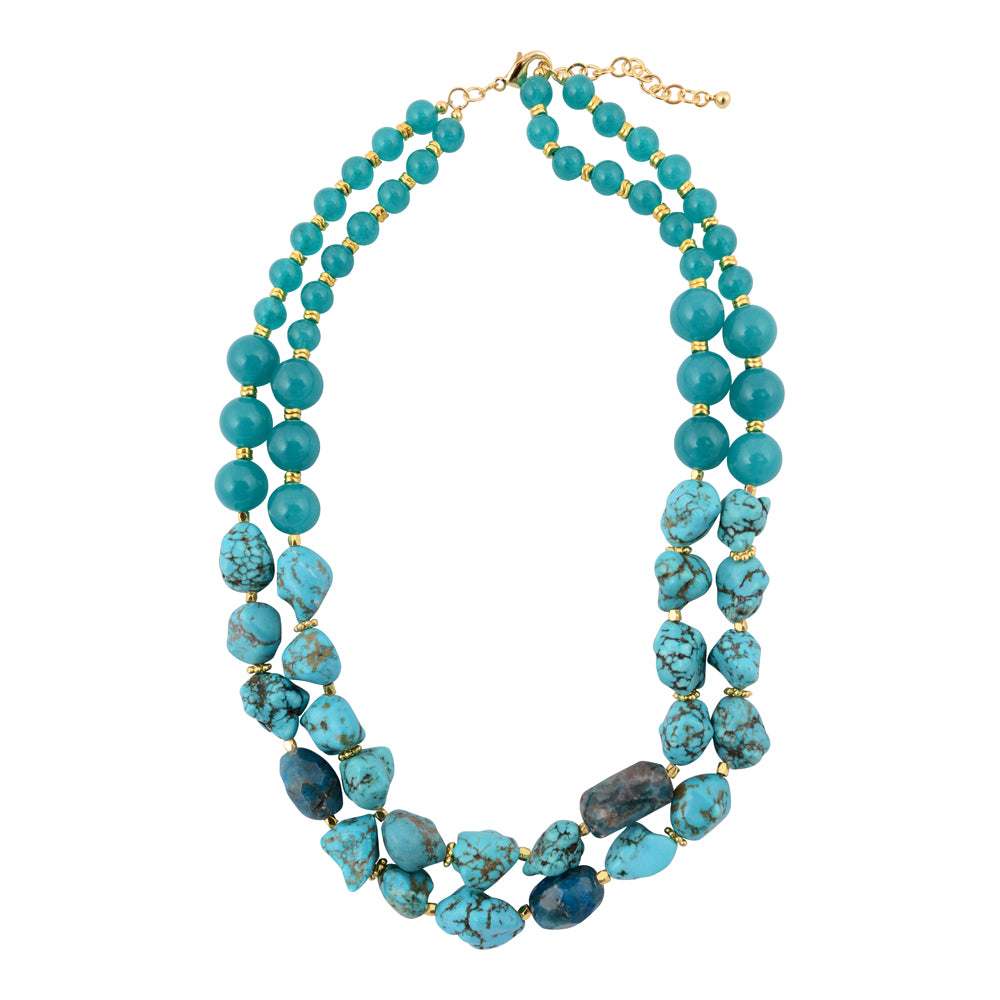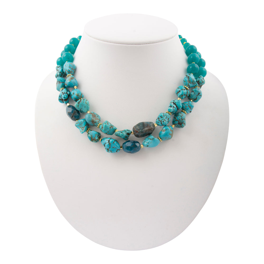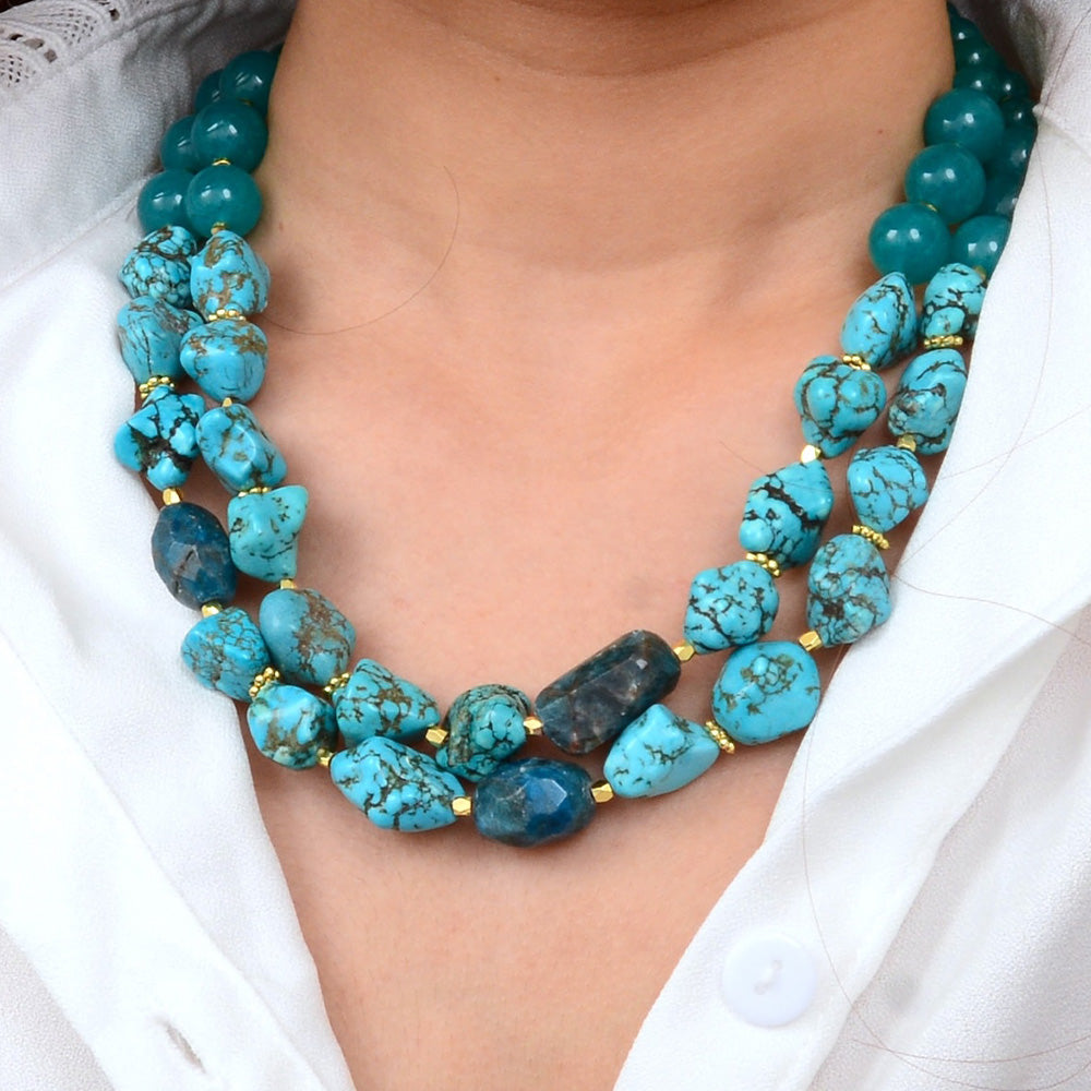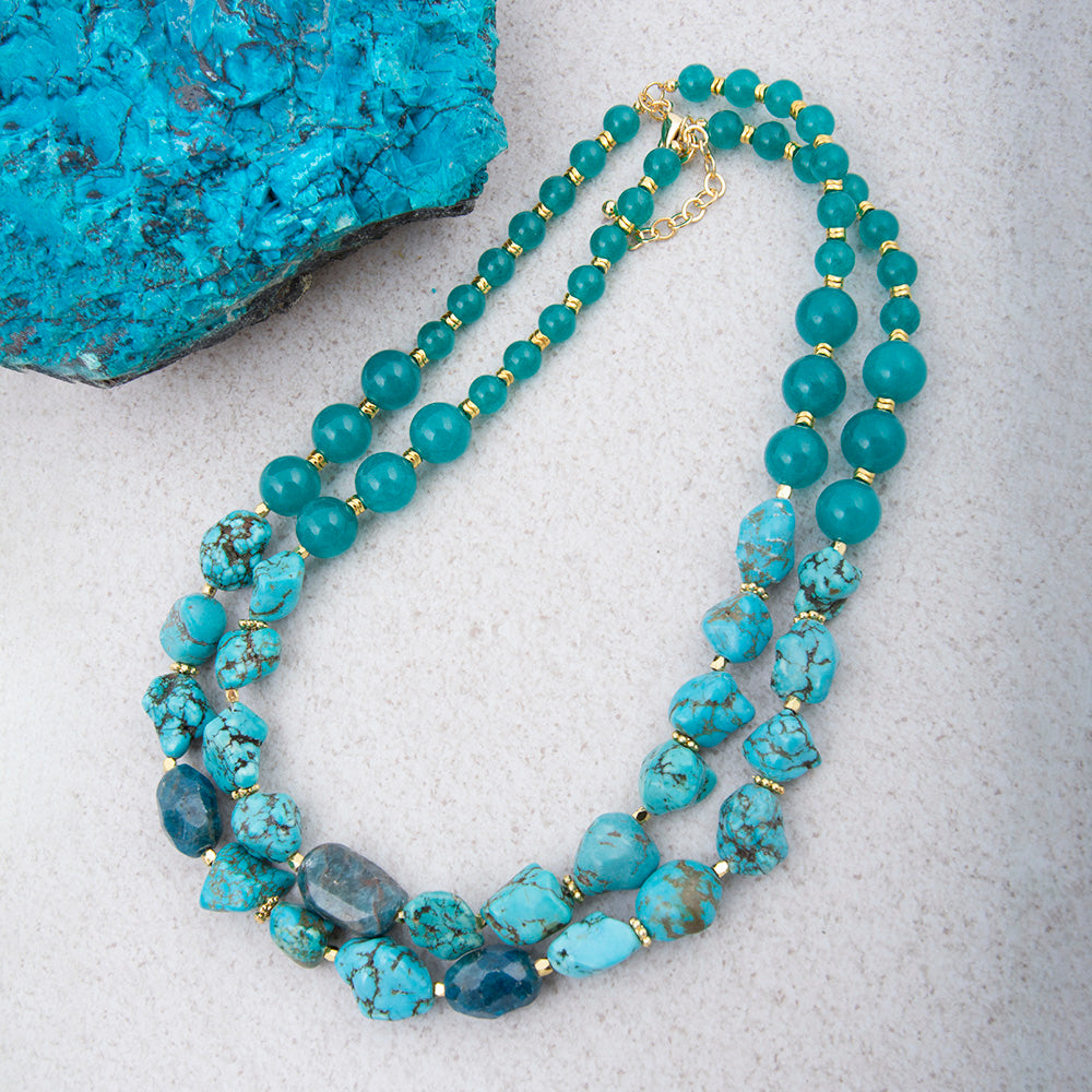 This striking two-strand necklace showcases the natural beauty of genuine blue jade, genuine blue apatite, and genuine blue magnesite beads.  One of the strands measures 17.5" in length while the second one measures 19.5" creating dimensional visual interest. The design features an 18k gold-plated lobster clasp with a 2" extender chain for versatile styling. At its widest point, the necklace measures .56" and weighs a total of 140.65g, offering substantial presence without excess. Each piece is meticulously hand-crafted and finished, ensuring unique character and refined quality befitting a statement accessory.
