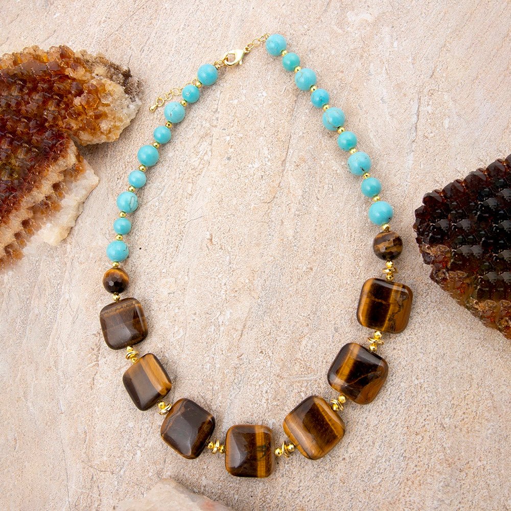 Blue Magnesite and Tiger's Eye Chunky Golden Necklace