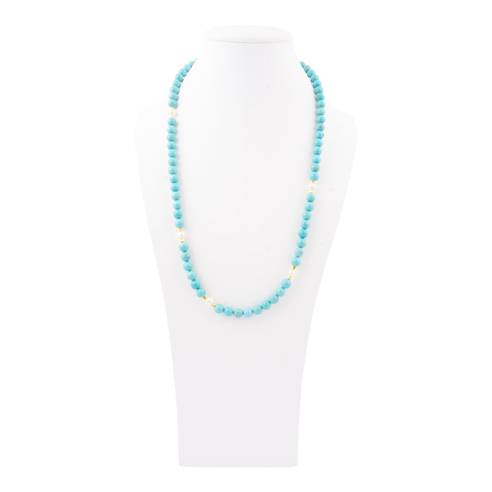 This elegant necklace showcases a 26.5" strand of genuine blue magnesite and white pearl beads, accented by golden hematite beads. It includes a 2" extender crafted from 18k gold-plated brass and secures with a lobster clasp. Measuring up to .33" at its widest point and weighing a total of 62.78g, this piece is meticulously handcrafted for a refined finish.