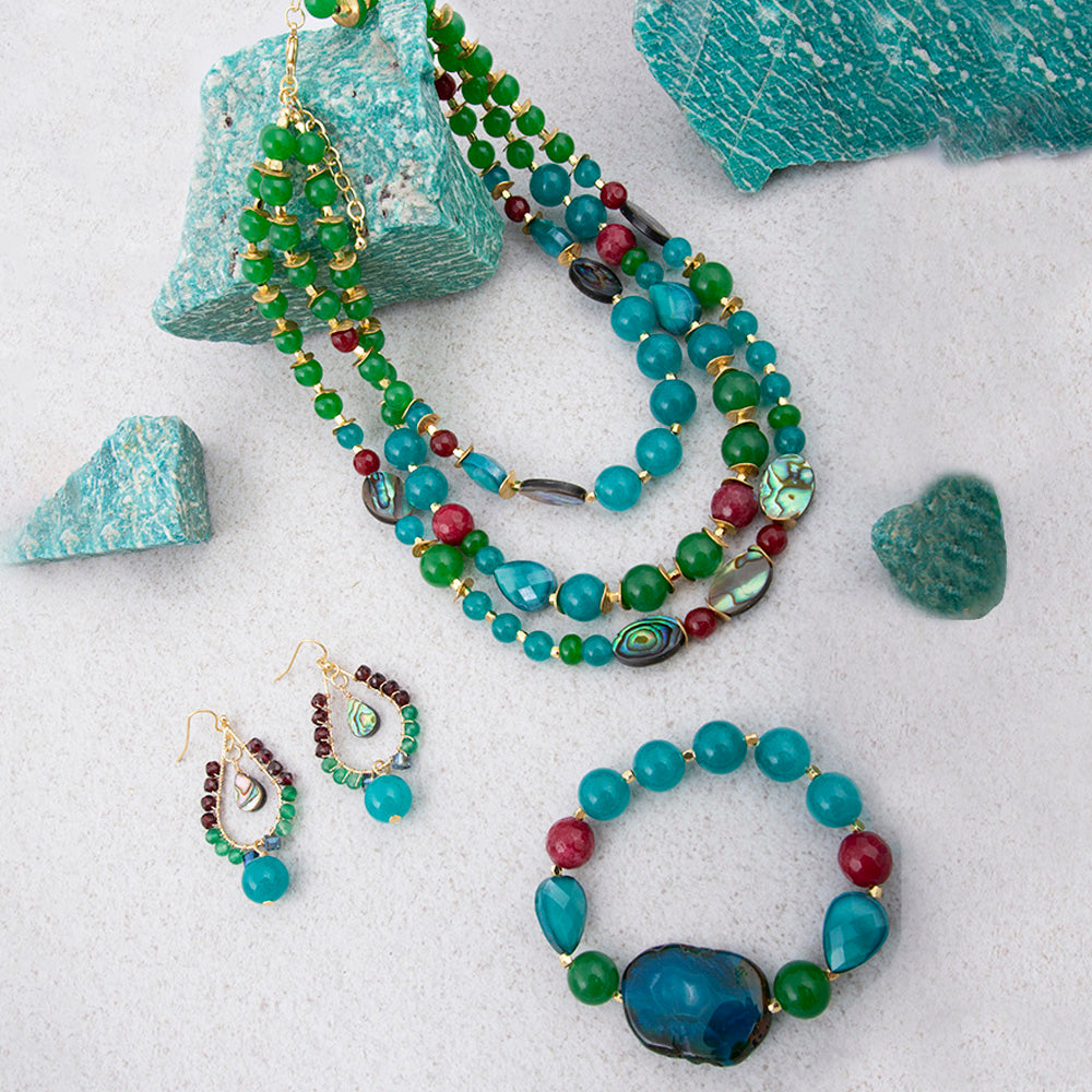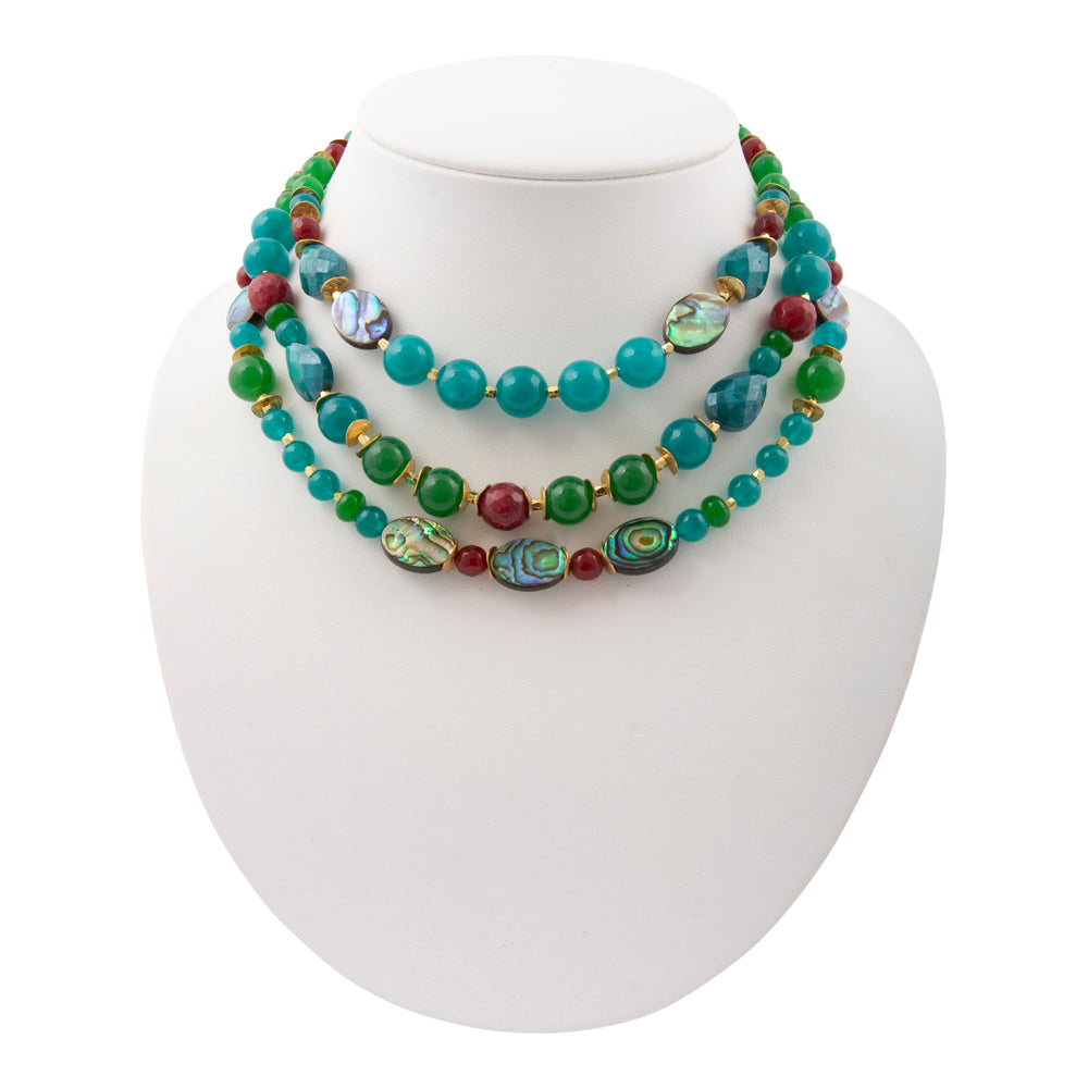 Elevate your jewelry collection with this sophisticated multi-strand statement necklace, featuring genuine red ruby, genuine green agate, genuine blue jade, genuine abalone, and teal crystal accents unified by warm 18k gold-plated brass detailing. Three gracefully layered strands—measuring 16", 18.5", and 20"—offer versatile styling options, plus a 2" adjustable chain extender and secure lobster clasp ensure a perfect fit. With the widest point of .49" and a total weight of 139g, this hand-crafted piece makes an undeniable impression. Each necklace is individually finished by artisan hands, guaranteeing a truly one-of-a-kind accessory.