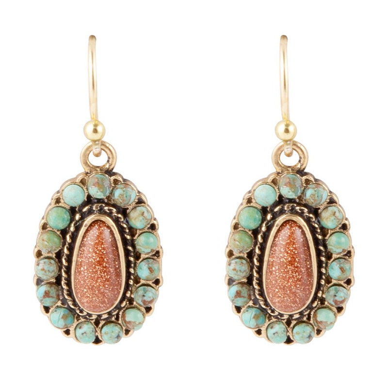 Experience luxurious style with these unique Little Sedona Turquoise and Goldstone Earrings. Handcrafted with genuine turquoise stones that surround a stunning goldstone centerpiece and intricate bronze bezel. Enjoy the beauty of nature as you take in the 1.25" drop from the ear wire. Steal the show with these exquisite earrings!