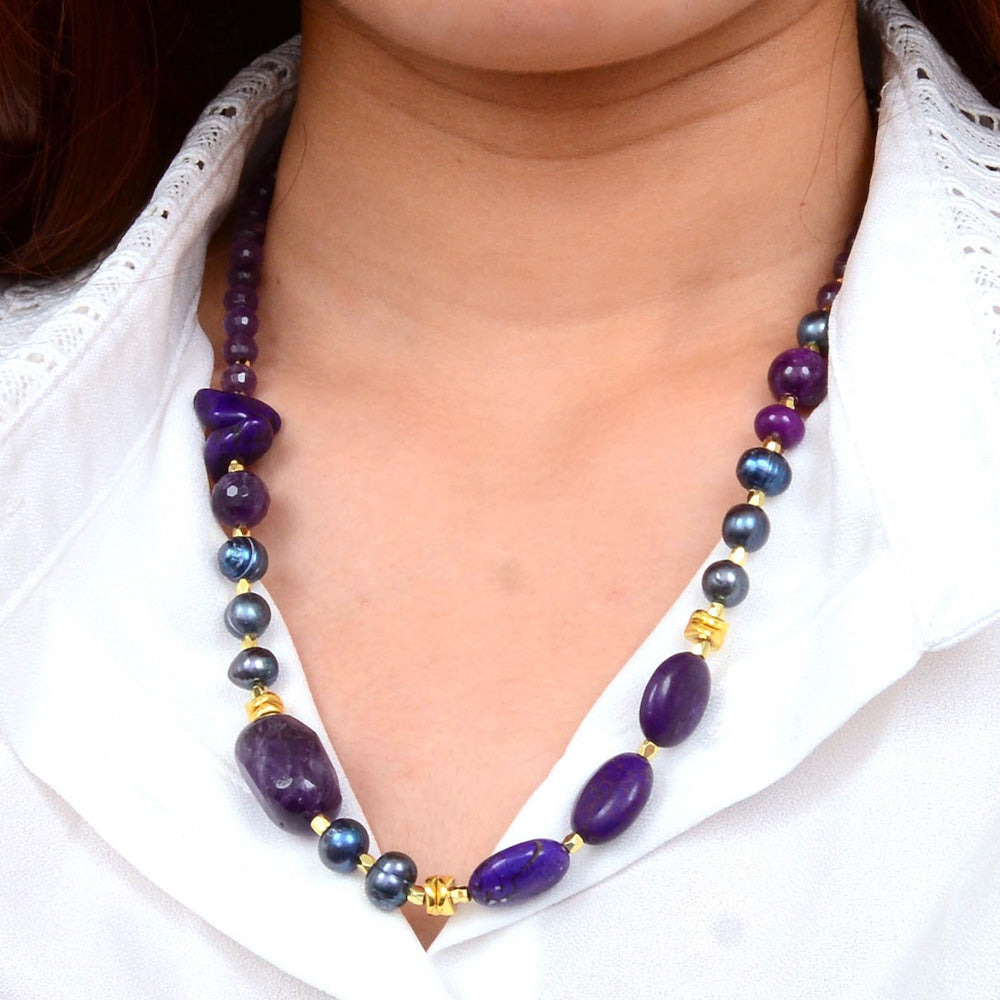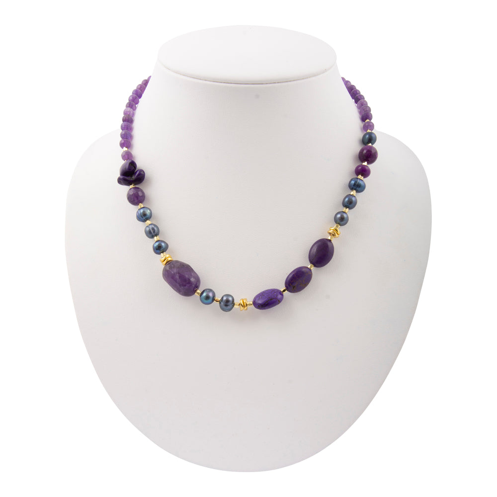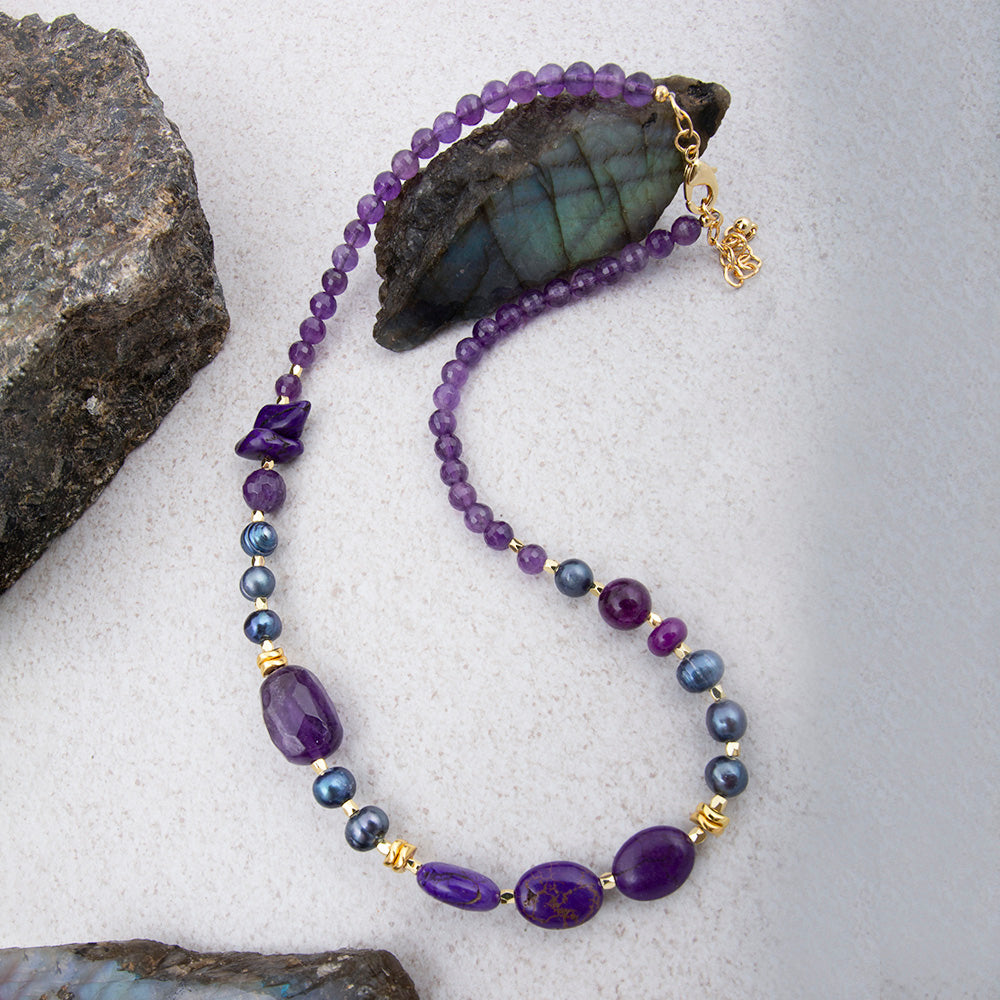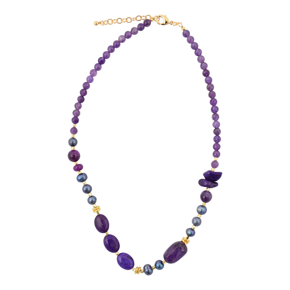 Elevate your collection with this striking necklace, featuring genuine purple amethyst, genuine purple magnesite, and genuine purple pearl beads set in 18k gold-plated brass. The 19-inch strand extends with a 2-inch adjustable chain and secure lobster clasp, and its widest point of .49-inch creates an impressive presence. Weighing a total of 39.7 grams, each piece is meticulously hand-crafted and finished to showcase the natural beauty of these precious gemstones.