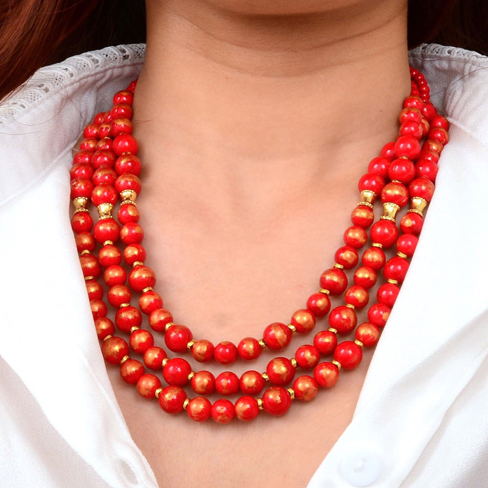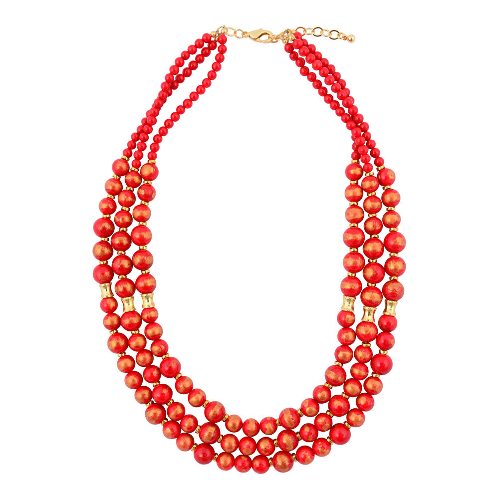 This luxurious statement necklace presents three distinct strands of genuine red jade beads with 18K gold-plated brass detailing, each graduating in length from 18" to 19.25" to 20" long for a refined, layered aesthetic. The red jade reaches its maximum width at .41", creating a bold focal point. Completed with a 2" 18K gold-plated brass chain extender and lobster clasp for versatile styling, the piece weighs a total of 108.9g. Every detail is meticulously hand-crafted and finished, embodying timeless elegance and artisanal quality.