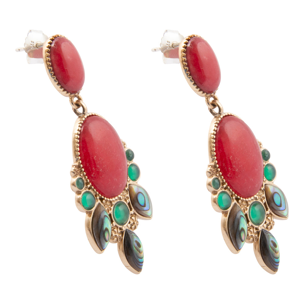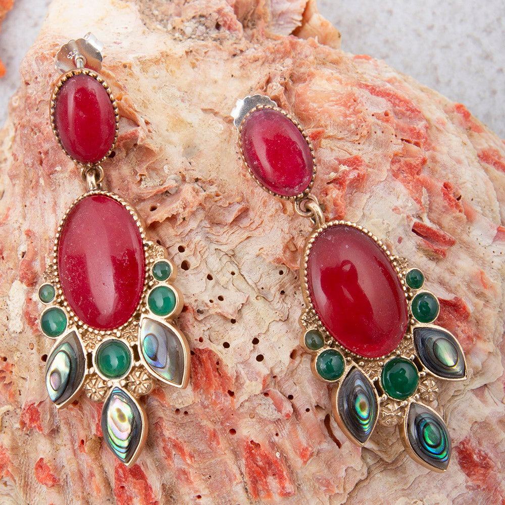 Elevate your look with our Regalia Red Onyx Golden Post Drop Earrings. These earrings feature golden bronze and a mix of genuine red onyx, green quartz stones, and genuine abalone stones, creating a luxurious and unique design. Hanging 1.95" from sterling silver ear posts, these earrings are .75" at the widest point and weigh a total of 11g. Add a touch of elegance to any outfit with these beautiful statement earrings.