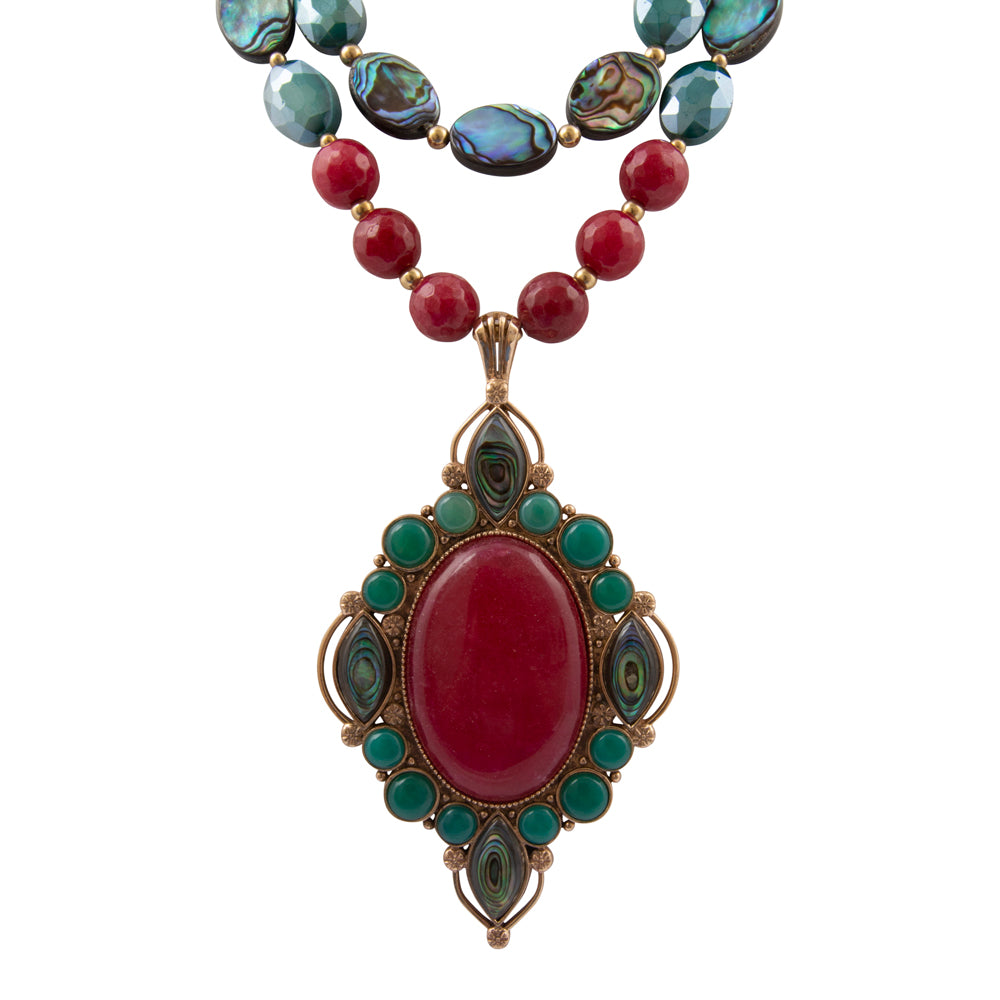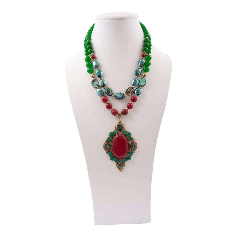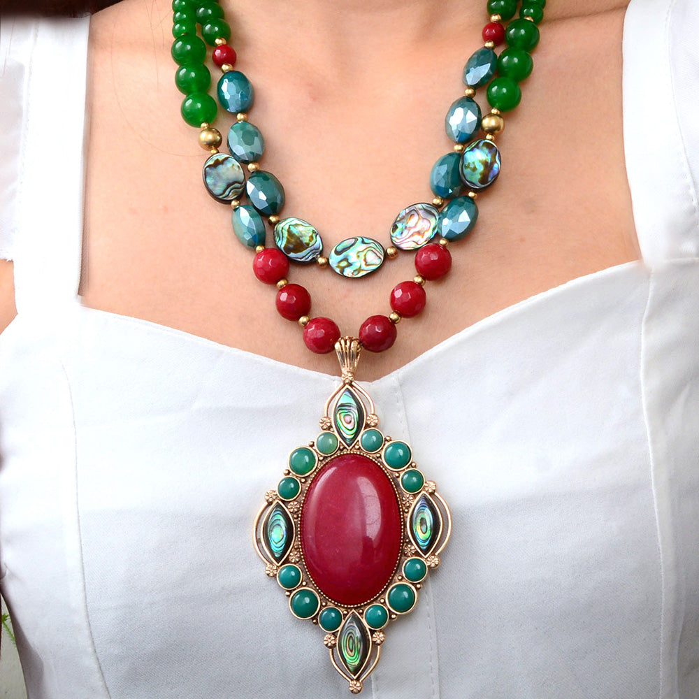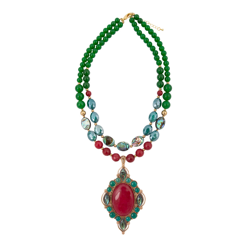 This sophisticated statement necklace features a dual-strand design showcasing genuine green quartz, genuine abalone, deep red ruby, and teal crystal elements. The first strand measures 19.5 inches with the second extending to 20.5 inches, complemented by a 2-inch adjustable chain extender and secure lobster clasp. A striking handcrafted pendant of genuine abalone and genuine red and blue onyx set in golden bronze serves as the focal point, measuring 4.15 inches in length with a 2.35-inch width at its widest point. Weighing a total of 160.4 grams, this artisan-finished piece combines luxurious natural materials with meticulous craftsmanship for an unforgettable layered look.