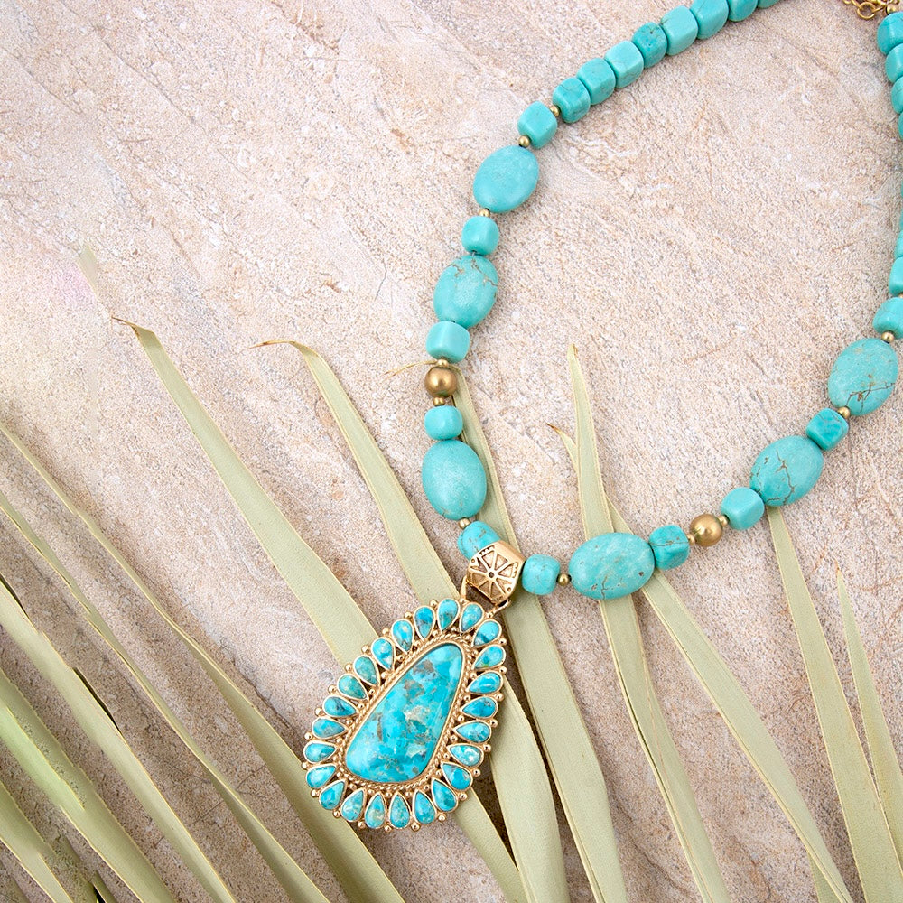 Expertly handcrafted, this necklace is composed of a strand made of genuine blue magnesite stones and features a pendant made of genuine blue turquoise set in golden bronze. The necklace measures 16.75 inches in length plus a 2" chain extender and a secure lobster claw, the pendant is 2.98 inches long and 1.60 inches wide at its widest point, with a total weight of 83.3 grams.