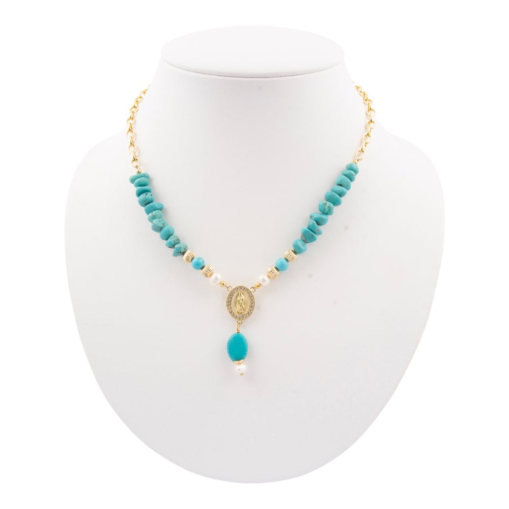 This exquisite necklace is expertly handcrafted using genuine blue magnesite and genuine white pearls, complemented by an 18k gold-plated brass chain and accents. The pendant features Our Lady of Guadalupe, adorned with a genuine blue magnesite oval stone and a delicate pearl. Measuring 1.73" in length and 0.55" at its widest, the necklace spans 17" with an additional 2" extender, secured by a lobster clasp. Weighing a total of 23.4 grams, this piece elegantly combines sophistication and meaningful design.