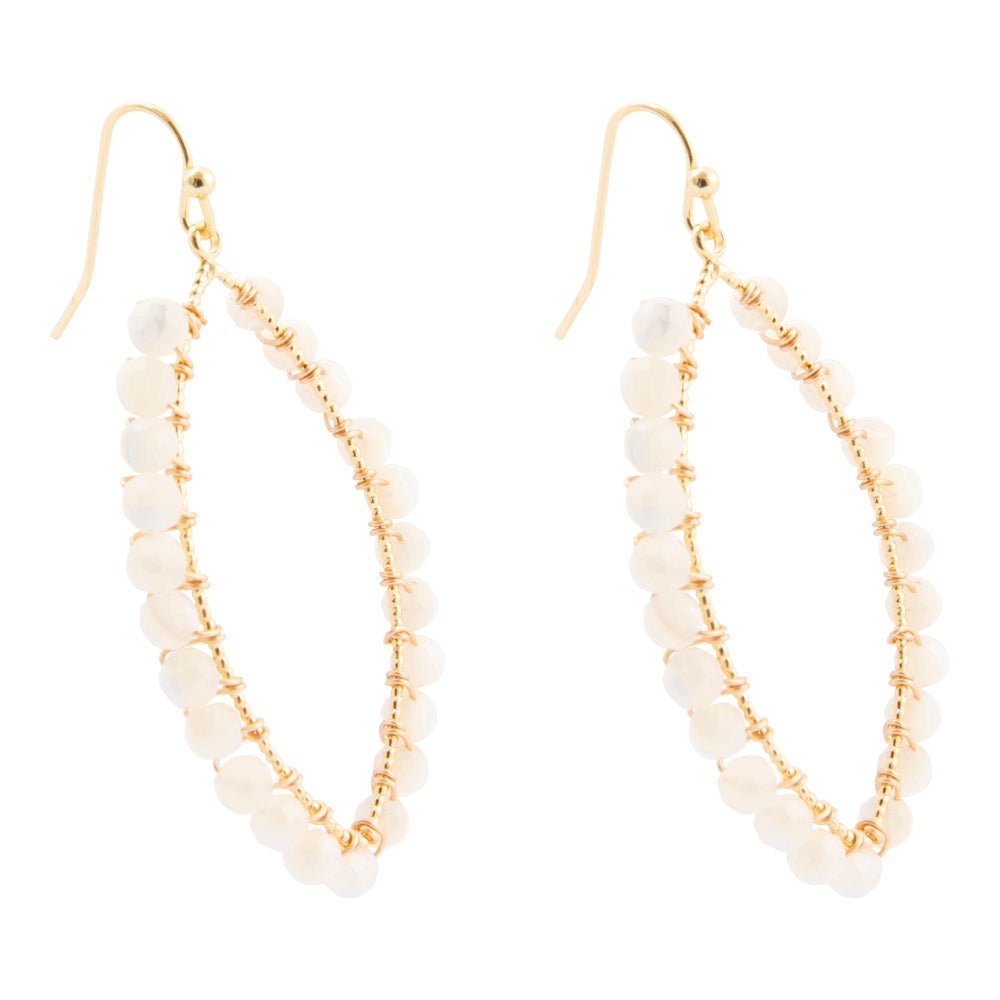 These earrings showcase genuine white mother of pearl beads framed by 18k gold-plated brass in a delicate teardrop shape. They measure 2.43" from the ear wire and span 1.14" at their broadest point, weighing 7.29g. Each pair is carefully handcrafted and expertly finished.